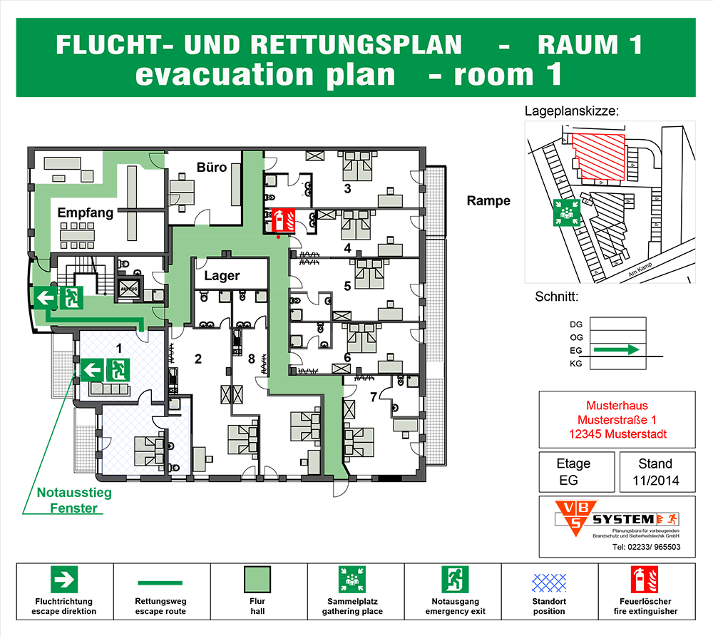 Selbstverständlich zeigen diese Pläne auch die Standorte von Selbsthilfeeinrichtungen wie Feuerlöscher, Wandhydranten etc.